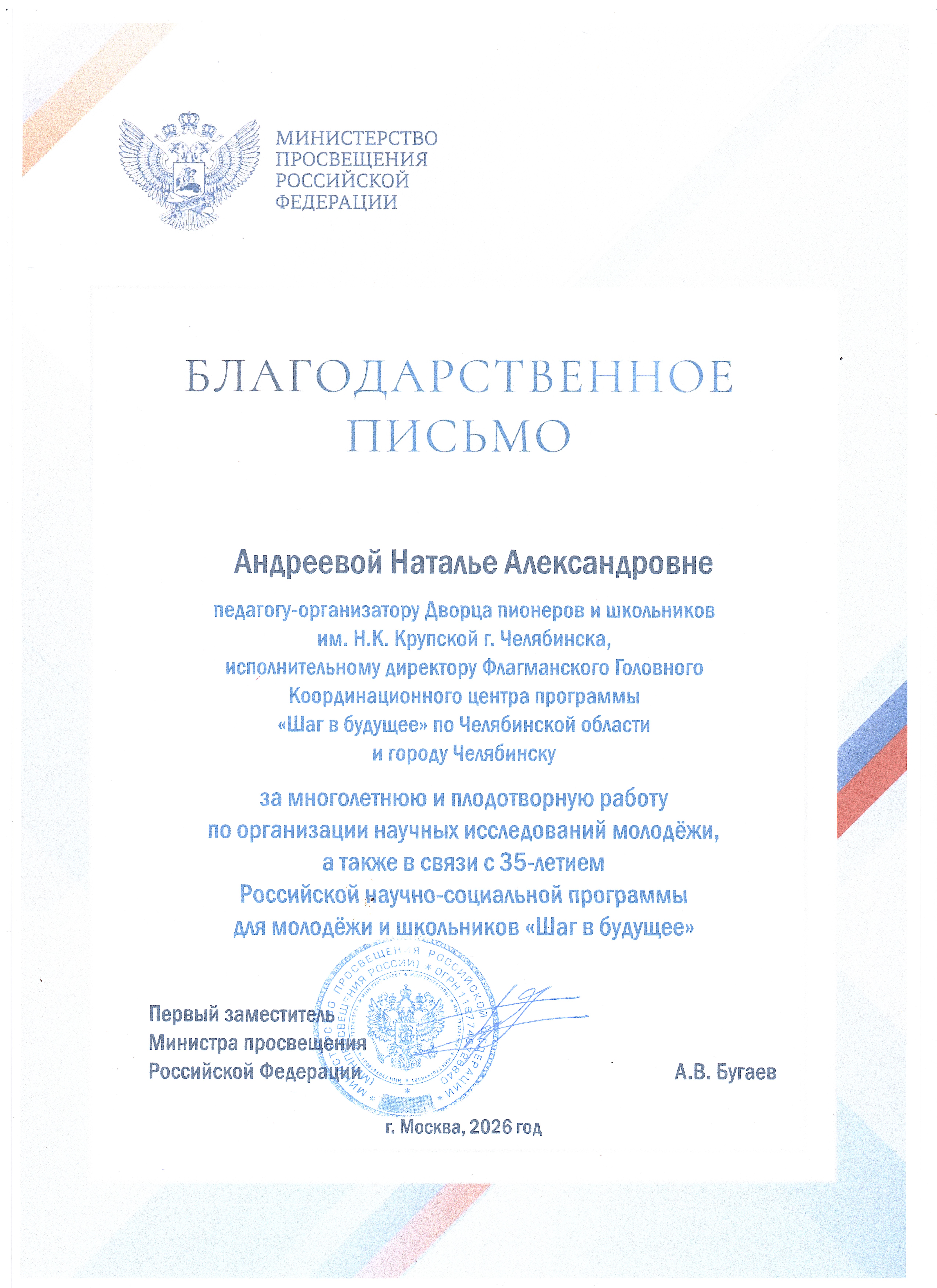 Письмо о включении программы "Шаг в будущее" в деятилетие науки и технологии